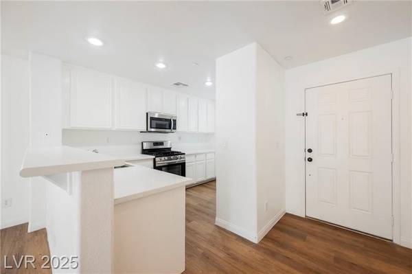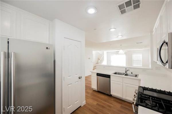 Tastefully upgraded 3-bedroom house for sale in Henderson with Tons of Amenities. Popular gated community with playground, basketball courts, BBQ area, community pool/spa and designated RV parking spaces. Nearly 1,500 Sqft with 3 bedrooms, 2.5 bathrooms and a 1-car garage. Open layout with modern laminate flooring, neutral colors, built-in speakers and ceiling fans. Fabulous gourmet kitchen with breakfast bar, pantry, Quartz countertops and S/S appliances. All 3 bedrooms are upstairs and feature plush carpeting and ceiling fans. Lovely master suite with walk-in closet, tub/shower combo and your very own balcony with community and mountain views. Guest bedrooms share a full bath with tub/shower combo. Upstairs laundry with washer/dryer. Easy maintenance desert landscaping in backyard with access to trail. Attached 1-car garage.