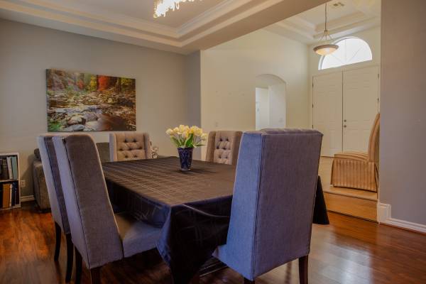 Beautiful tastefully upgraded Single-story home for sale in desirable gated community in Seven Hills. 2,250 Sqft with 3 bedrooms, 2.5 bathrooms and a 3-car garage. Wonderful open layout with new engineered hardwood flooring. Fabulous gourmet kitchen with open sight lines, Extra-large island with breakfast bar, Quartz countertops, walk-m pantry and lots of natural light. Formal dining room with custom chandelier. Luxurious primary suite with ceiling fans and walk-in closet. Spa-style primary bathroom with modern vanity, bathtub and separate shower with custom tile work. Guest bedrooms share a full bath with tub/shower combo featuring custom tile work all the way to the ceilings. Easy maintenance desert landscaping in backyard with covered patio and mountain views.