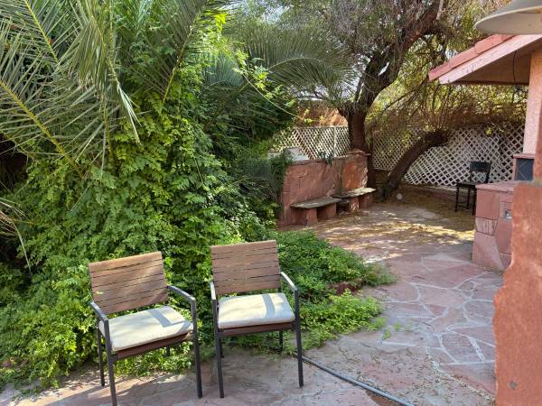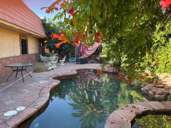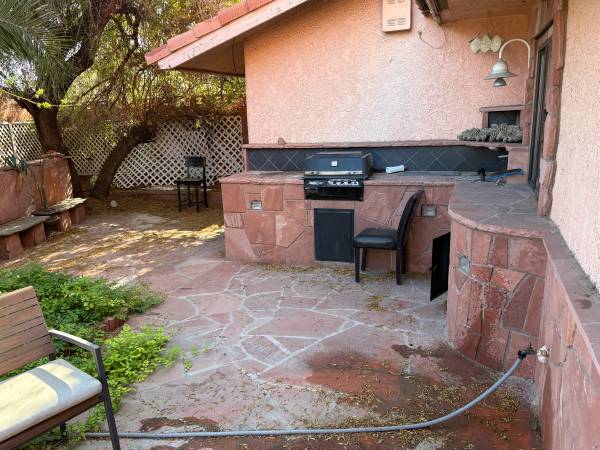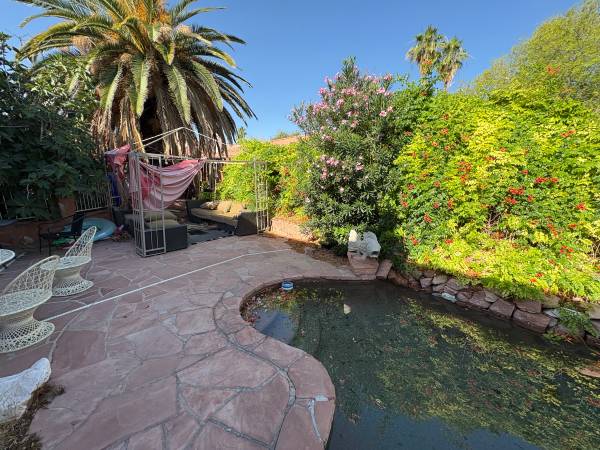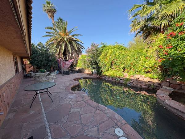 Wonderful single-story ranch-style home for sale in with POOL & SPA! Older community in central location with no HOA - quick drive to downtown and LV Strip. 2,200+ Sqft with 3 bedrooms+Den, 3 full bathrooms and a 2-car attached garage. Formal living room and separate family room with custom mediterranean stone-tile flooring, stone accent walls, upgraded lighting fixtures and a media niche with a real wood-burning fireplace. Spacious gourmet kitchen with breakfast bar, updated cabinetry, granite countertops, and all appliances. Large bedrooms with tile flooring and 3 full bathrooms. Huge primary bedroom suite with ceiling fans and walk-in closet. Primary bathroom features dual sinks with a roman tub and separate tub. Large private serene palm treed backyard oasis with BBQ bar patio, sparkling lagoon-style swimming pool, waterfall and spa.