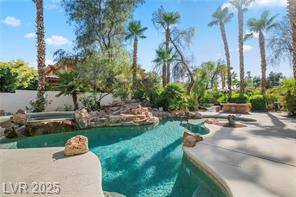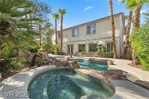 This exquisite guard-gated 4,549 SF two-story custom home offers unmatched privacy, luxury, and proximity to world-class entertainment. Just blocks from the Las Vegas Strip! This home features 5 bedrooms, 4 full baths, an office/library, a sunroom, and a media room. The open floor plan offers vaulted ceilings and a chef’s kitchen with granite counters, stainless steel appliances, and an island with a breakfast bar. The spacious family room features surround sound and a built-in entertainment system. The luxurious primary suite boasts a double-sided fireplace; secondary bedrooms have walk-in closets. Enjoy a media room with immersive sound and a tropical backyard oasis featuring a Pebble Tec pool, waterfall, heated spa, and lush landscaping. Finished 3-car garage with epoxy floors and central vacuum, and located minutes from Allegiant Stadium, the airport, and shopping. This home delivers the ultimate blend of luxury, comfort, security and location.