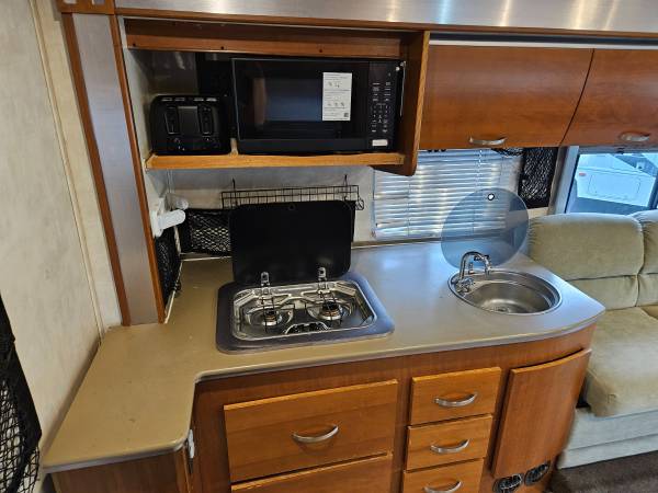 Kitchen has Full Size Gas/Elec Fridge, 2 Burner Cooktop, Microwave, Toaster, and Sink!