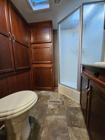 The Large Rear Bathroom is the Highlight of this Travel Trailer! Radius Shower plus Storage Everywhere!