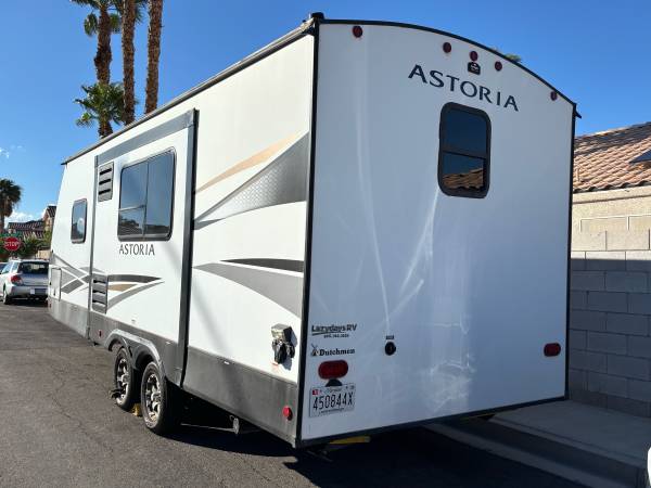 Here we have our 2022 Dutchmen Astoria 2203RB travel trailer for sale. It’s 26 feet long with a 8 foot power slide out. It’s all fiberglass and aluminum construction makes it out to a little over 5k lbs total weight, so it’s half ton towable. Tandem axles, full length power awning, dual propane tank, power tongue jack, power four corner leveling jacks. Plenty of storage in and out. Four burner propane stove with oven and hud. Microwave oven. Large refrigerator freezer double sided stainless sink. King size walk around bedroom. Large restroom area with glass door shower. I barrel ceiling throughout. No leaks, no rot, no mold, no rust, no pets, non-smoking RV. Clean title in hand. Motivated to sell. Please feel free to ask any questions you may have. The NADA and blue book value is just under $32,000 dollars your research and see for yourself. I am asking close to $10k below that for a fast easy cash in person transaction. I may trade for a old muscle car. from early 60s to early 70s