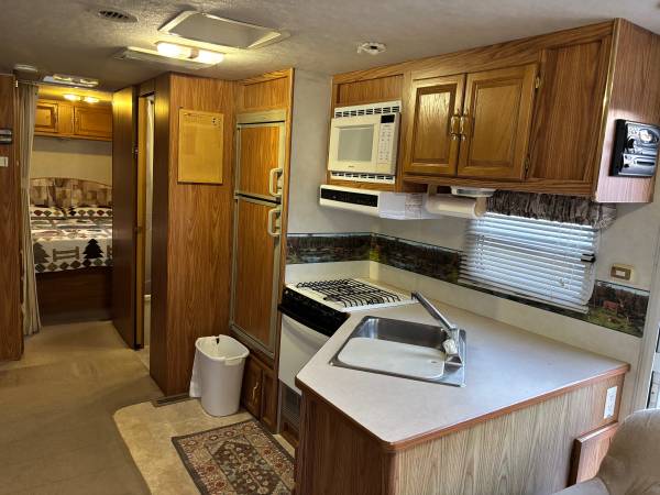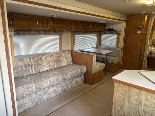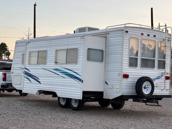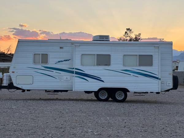 Selling a non-smoking, no pets queen bedroom, upfront double door entry, full restroom, full kitchen, equipped with a solar panel, dinette booth, and sofa sitting on a super slide with both turning into small beds power tongue jack tires are like new condition. The roof has been resealed everything working just like it should clean title and all owners manuals in hand comes with equalizer hitch asking for 6,500 and looking for serious cash ready buyers only please! (702)610-3837