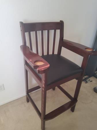 Wall mounted billiard rack $100. 39"W x 55"H x 4.5"D Good condition Tall billiard chair $100. 47"H x 29"W x22"D Good condition Text Al