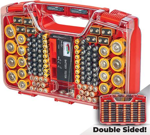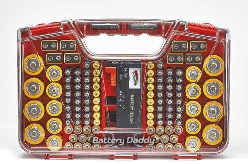 Battery Daddy New battery organizer that holds up to 180 different types and sizes batteries with a storage/carrying case with a multi battery tester that tests any and all standard sizes of batteries. Easily stores away in any drawer or shelf.