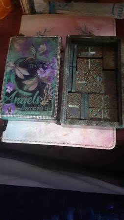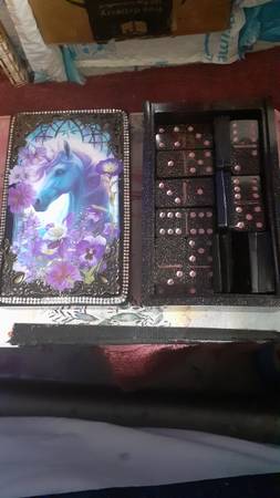 Handmade assorted color and design of custom resin domino box sets with matching dominoes. A 28pc resin domino set.