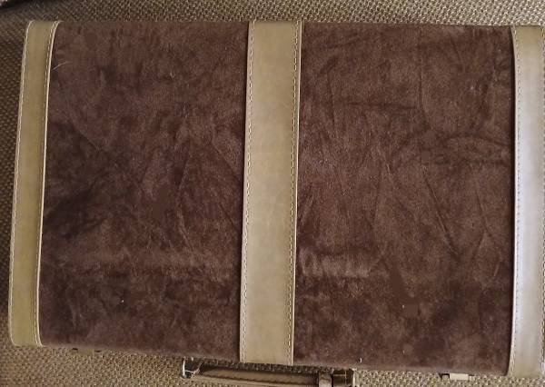 Vintage Backgammon Set. Brown and Ivory color Bakelite Checkers. Faux Leather and Suede Carrying Case With Latches. Includes two Dice Shakers. Missing 1 ivory color checker