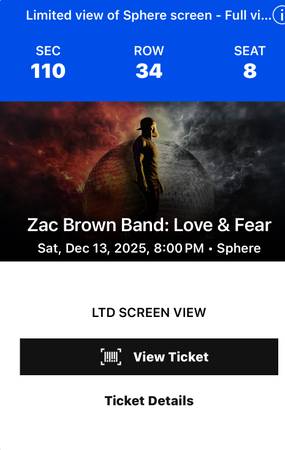 2 Zac Brown Band tickets for December 13 th show at the Sphere. Section 110row 34 seat 7 & 8. These are mobile tickets with bar code.