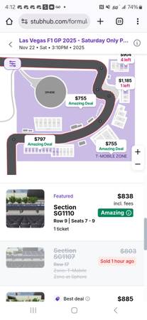 LAST CHANCE, tickets are stiĺl selling at 750 plus, 1200 in the section im in and as low to track.Not as interested in F1 as I thought I would be, bought the 3 day package for the experience, seat is in section SG1105 3rd row up from track and seat 3, looking to recoup some cost and save an extra day here in Vegas. B/O NO lowball as I know general admission going around 600. Race 8pm, f1 academy race at 4:15, I'm at the horseshoe.