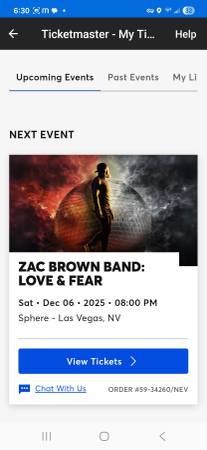 I have 4 tickets to the Zac Brown concert in Vegas at THE SPHERE on Saturday, 12/6/25. Section 102, row 5. These are great seats and the Sphere is an incredible experience! We saw the Eagles there...