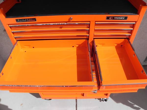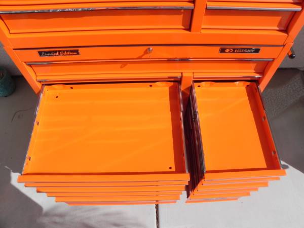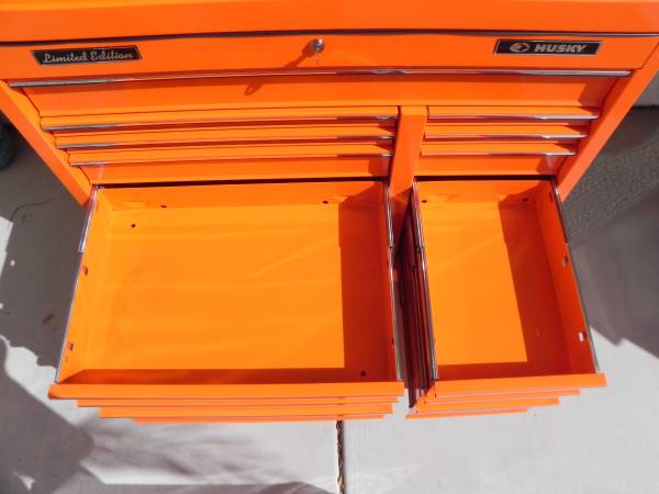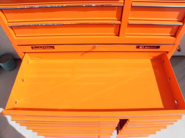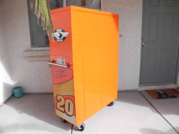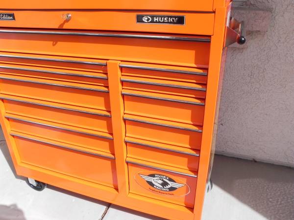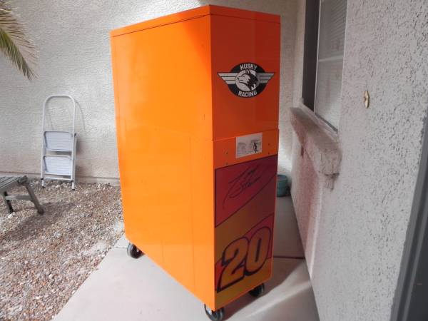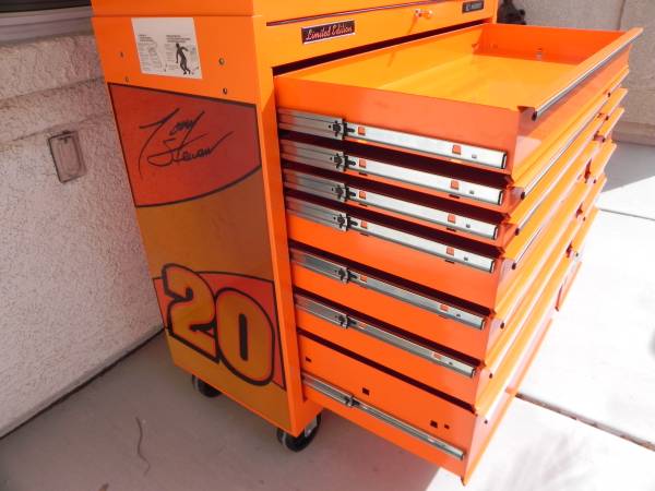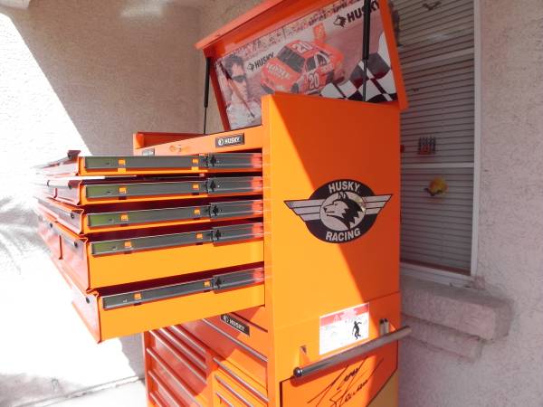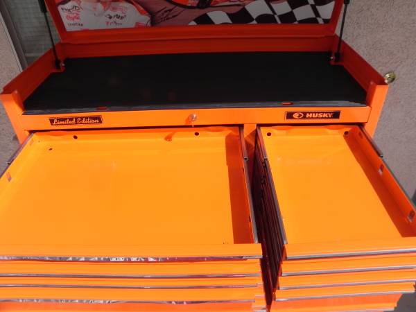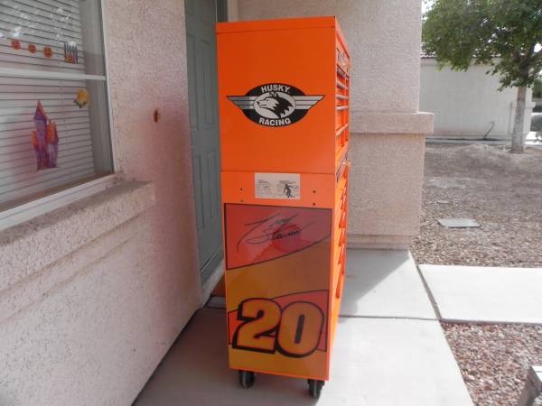 Beautiful Tony Stewart LIMITED EDITION Husky Racing Tool Chest Made In Canada (#1097). Pin Striping on some of the handles will either need to be glued or re stripped because the glue has dried on some of them. Ball Bearing Slides have the plastic tabs that makes them easy to remove and reinstall. One side tab goes up and the other goes down and you slide the drawers out. Alot of Snap-On have a similar system to remove your drawers. I believe the box was made around the year 2003 and is number 1097 of 2500 units made. Unit Measures 40-1/2'' Wide x 63-1/4'' High x 17-3/4'' Deep. Unit comes with 1 key for the top and 1 key for the bottom. All ball bearing slides work perfect and everything locks up good and tight. Unit is located in Las Vegas for local pick up. Call if interested.