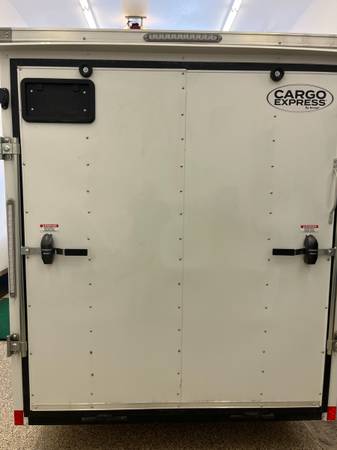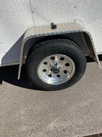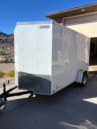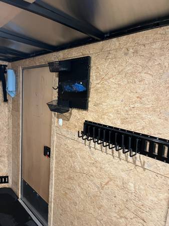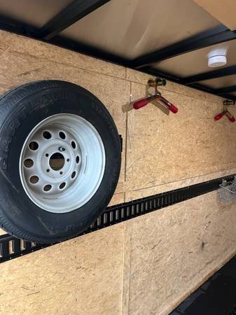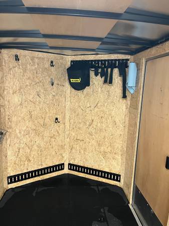 6x12 enclosed trailer in excellent condition. Actual inside measurements in pictures are 13'5"L x 68"W with 72" H door opening. Less than 2500 miles on it. Tires look like new and spare tire has never been used. Flat pad for front jack and also a wheel for jack. Custom mag wheels with dual locks, 2 rear door locks. Complete rubber floor including on the ramp. You get everything you see inside trailer. E-track, baskets, hooks, helmet bag, leather coat hangers, straps, hooks, wall mount bracket with baskets with gloves & hooks in picture. Two inside lights. One is detachable so you can carry it around. Rechargeable with a phone charger cord. $4,500.00 Cash.
