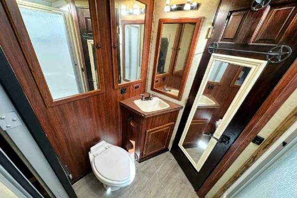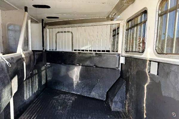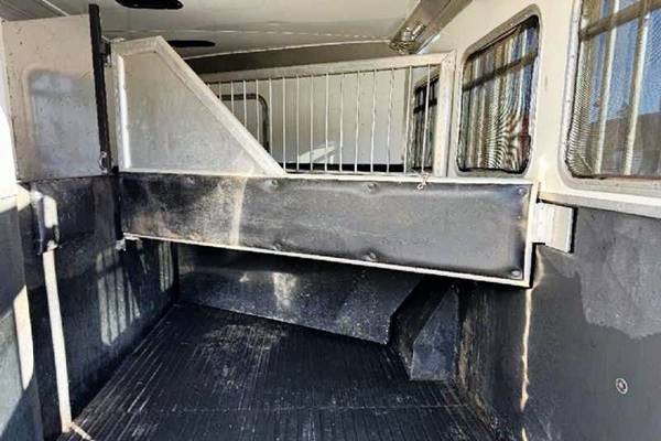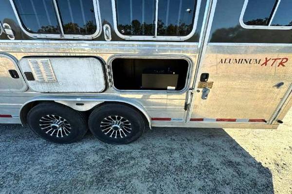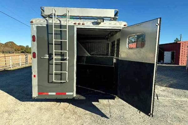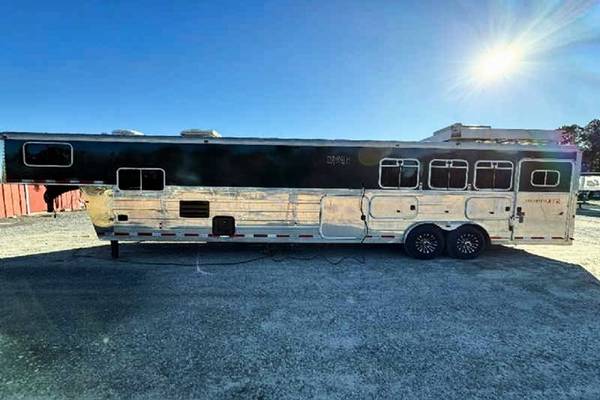 2007 Logan Coach 8314GLQ all-aluminum 3-horse trailer with 14′ short-wall living quarters cooktop, microwave, refrigerator, sofa, A/C, furnace, bathroom with shower and sink, walk-thru door, and...