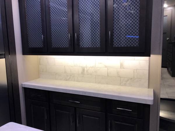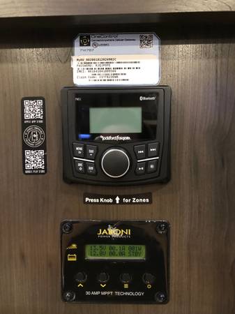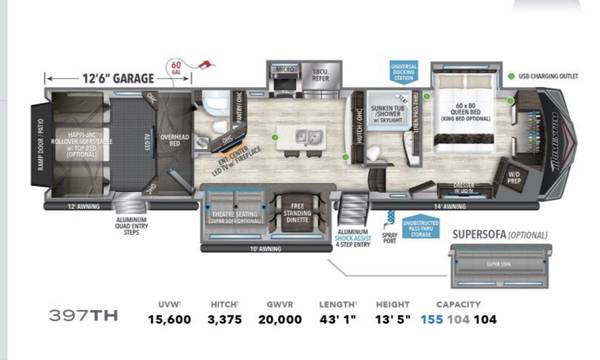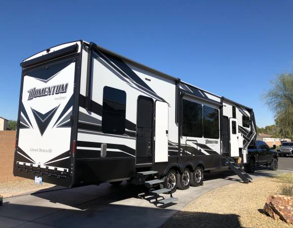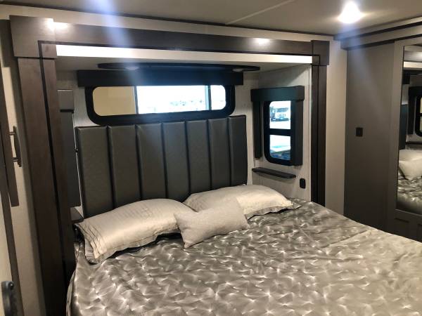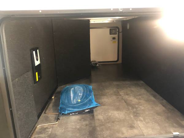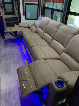 Beautiful toy hauler, like new, only used a few times. Completely self contained with large capacity water tanks. 2 Bathrooms/showers. King Bed Upgrade, laundry hook ups. Fireplace, (3)ea Smart TVs, Super Sofa 5 seater upgrade with heat and massage seats. Happiness-Jac Electric Bunk System w/Folding Sofas. Rear Aluminum Deck system w/Rear Power Awning, 3rd A/C 15K BTU, Solar Package w/3000W Panel, Control & 2000W Inverter, Onan 5.5KW Gasoline Generator, upgraded Cooper H-Rated Tires w/17.5” Wheels (triple axle), Under unit LED Light Kit, Exterior Entertainment Center, Rockford Fosgate Premium Sound, Built-in Vacuum System, Fresh Water Tank, Automatic 6 point hydraulic leveling