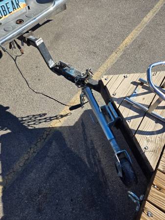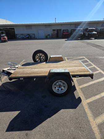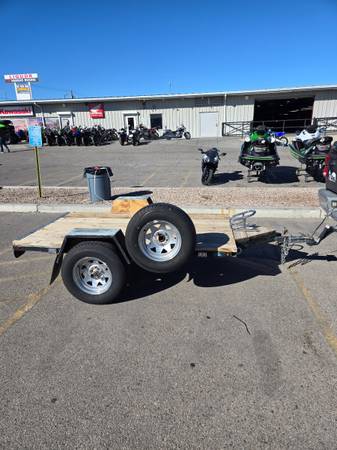 7 ft by 4 ft utility trailer used as a motorcycle/quad trailer no longer needed leaf springs suspension spare tire rack drop in place front wheel very easy to move around new wiring lights.