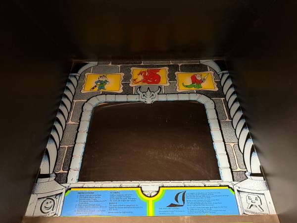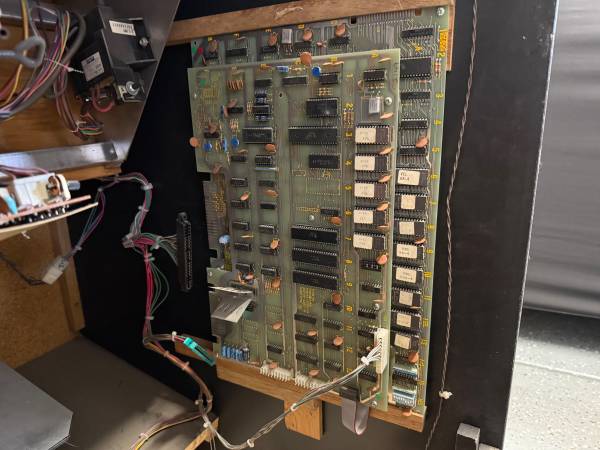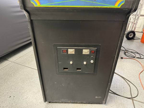 Super solid cabinet in excellent cosmetic condition. However, the side art has some peeling on the left front edge in the white area (see photos). Unfortunately, it's not working right now. Comes with the original manuals for the game and monitor, including schematics.