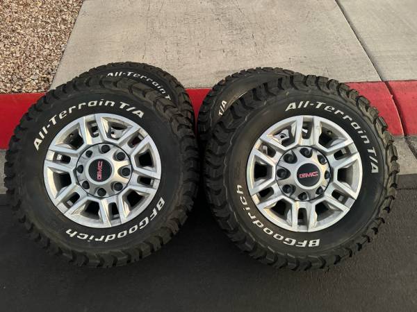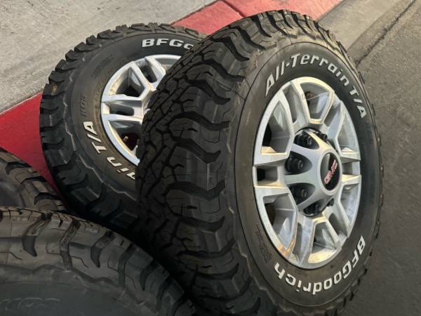 Text 406 499 281seven 950$ GMC Sierra 2500 Rims/tires 17” BFG kO3 265/70/17 Fits 2011-2025 trucks Load range e 10 ply Made in 2025