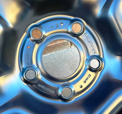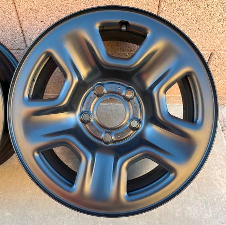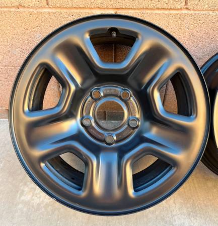 OEM steel rims for 2018-2025 Jeep Wrangler JL or Gladiator JT in like new condition. Only driven for about 50 miles with no scratches, dents, scrapes, rust, or other issues. Complete set with 5 rims and 4 hubcaps (no TPMS or lug nuts). Ready to install on any 2018-2025 Wrangler JL, but may be compatible with earlier models. Please confirm whether these will fit your vehicle BEFORE purchase. Hard to find new OEM rims like these at such a low price, but I need the space! Serious buyers only please, no returns.